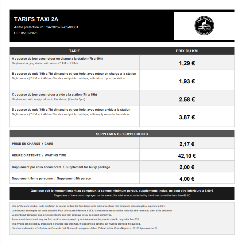 Chez Taxi Willy, la confiance et la clarté sont au cœur de notre service. Pour bien préparer la saison 2026, nous vous informons de l'entrée en vigueur des nouveaux tarifs officiels, fixés par arrêté préfectoral pour l'ensemble de la Corse-du-Sud.